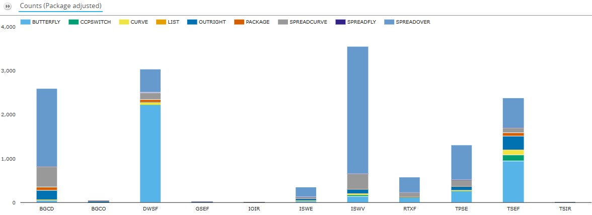 - TP ICAP’s volumes (from IOIR, ISWE, ISWV, TPSE, TSIR) are led by spreadovers, then curve spreads (SPREADCURVE), then butterflies, then outrights.